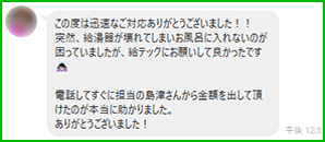 「お湯が出ない!」「水が漏れる」などエコキュートのトラブルは緊急対応がつきものです。給テックは、問合せには電話とLINEですぐに対応。現場近くにスタッフがいれば即日訪問の対応も可能です。お急ぎでお困りの方は、ぜひご連絡をお待ちしております。